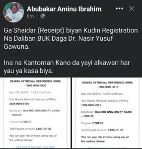 Abubakar Aminu Ibrahim a shafinsa na Facebook ya wallafa cewa “Ga Shaidar (Receipt) biyan Kudin Registration Na Daliban BUK Daga Dr. Nasir Yusuf Gawuna.